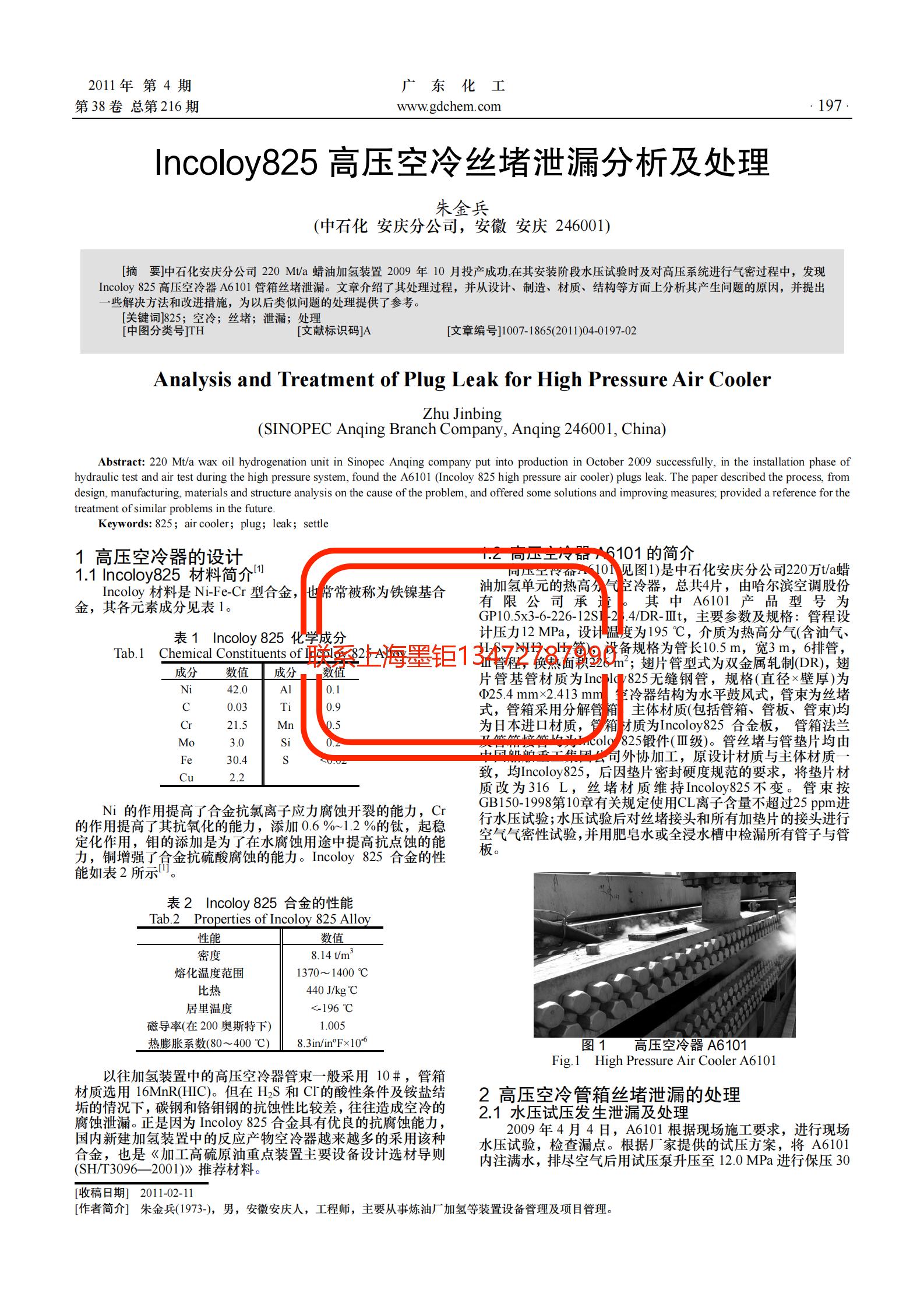 技術(shù)文章 Incoloy825高壓空冷絲堵泄漏分析及處理 更新時間 2021-07-13 06:46:16 閱讀 860 上一篇:INCOLOY825多波厚壁波紋管壓制過程 下一篇:空冷器管束用Incoloy 825復合鋼板設計厚度的探討