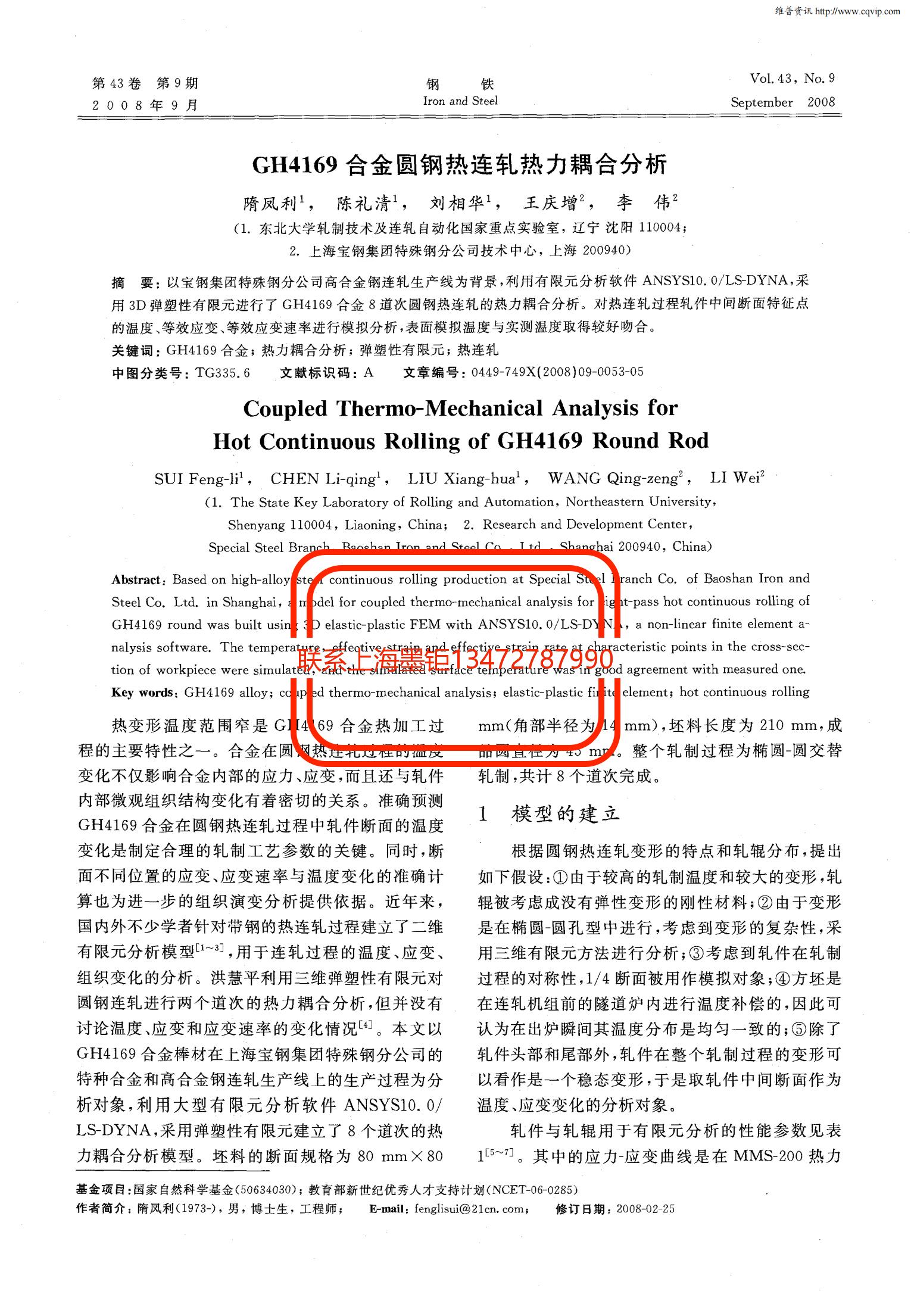 技術(shù)文章 GH4169合金圓鋼熱連軋熱力耦合分析 更新時(shí)間 2021-07-13 06:56:01 閱讀 778 上一篇:空冷器管束用Incoloy 825復(fù)合鋼板設(shè)計(jì)厚度的探討 下一篇:GH4169材料波紋管焊接工藝研究