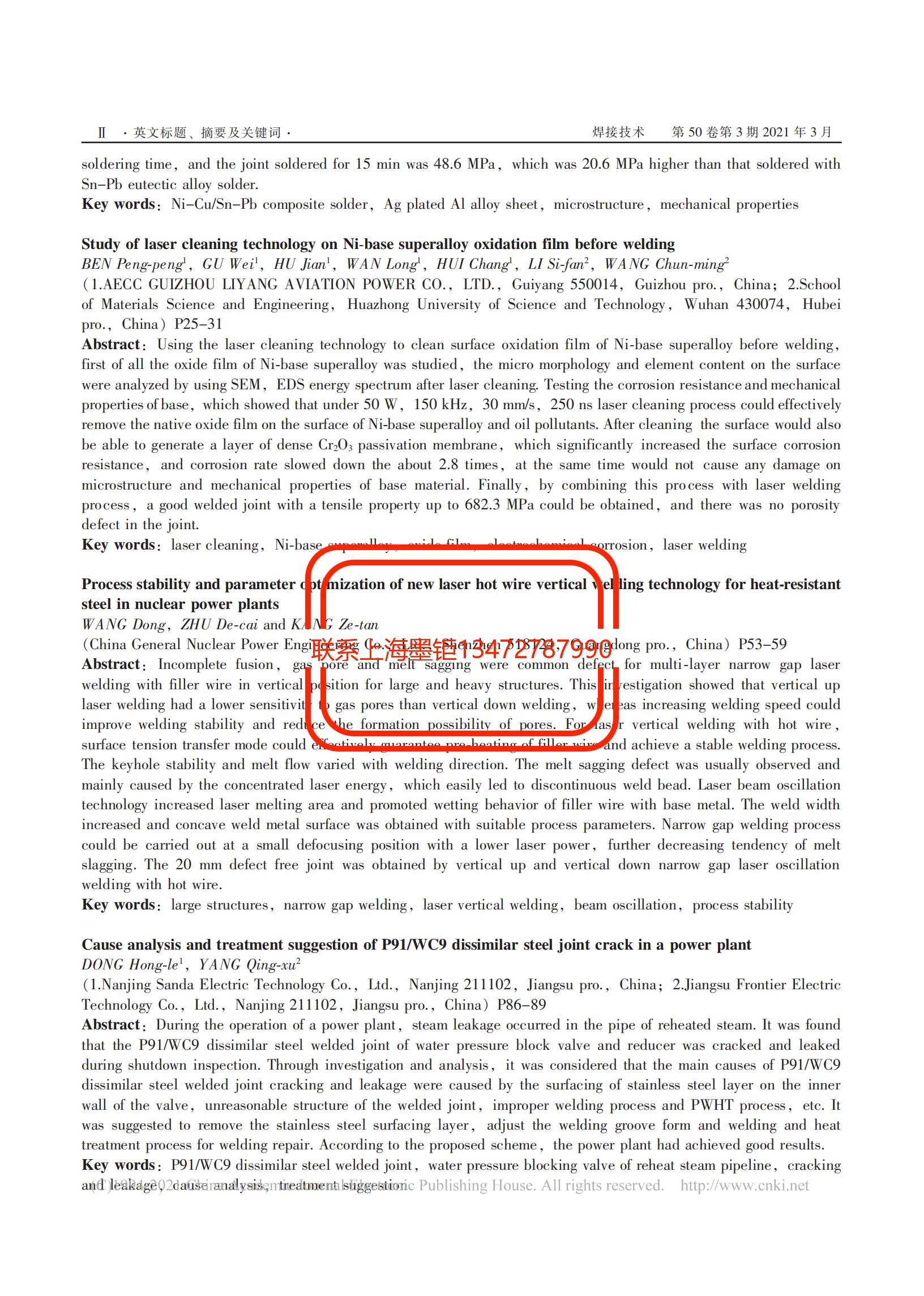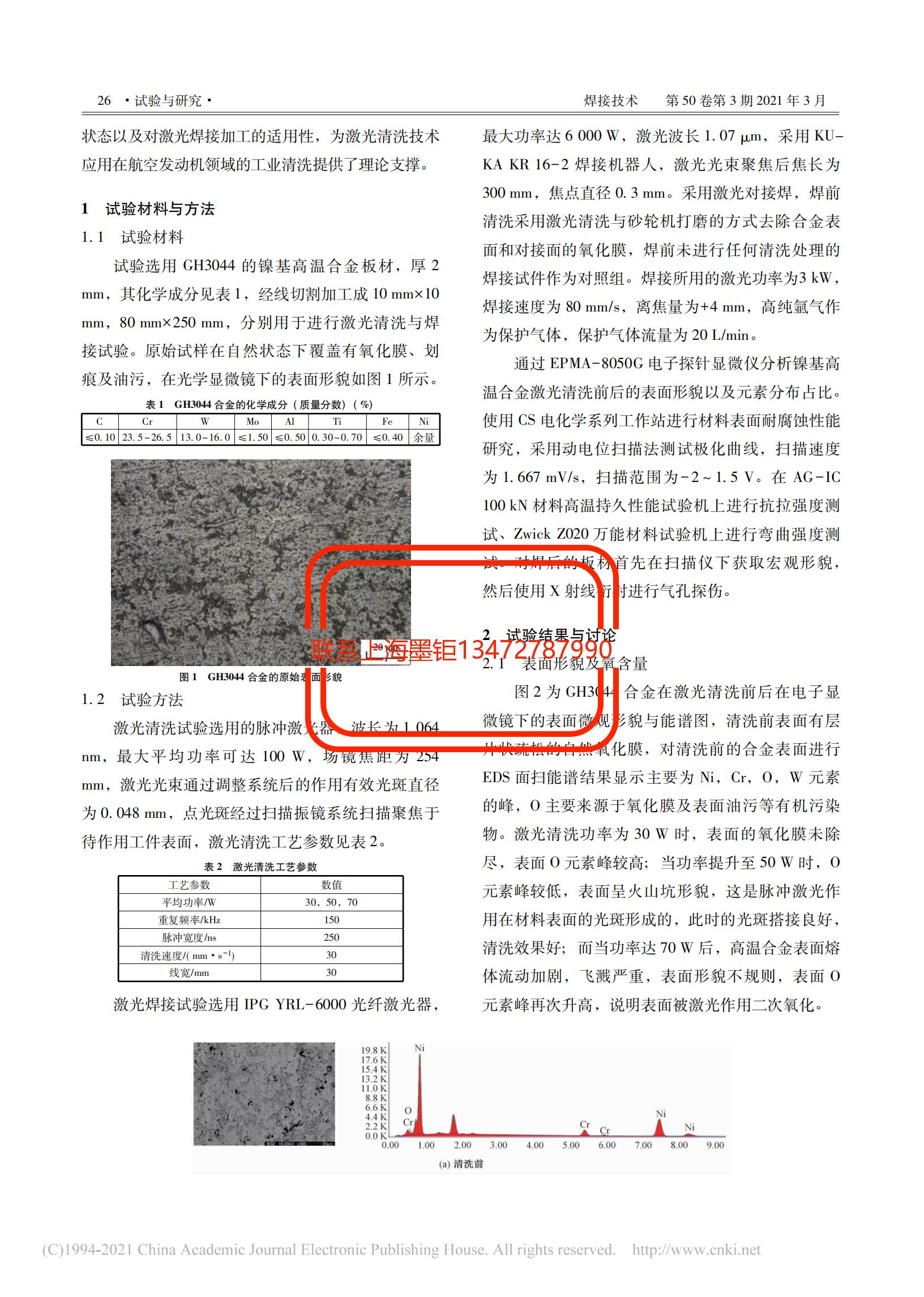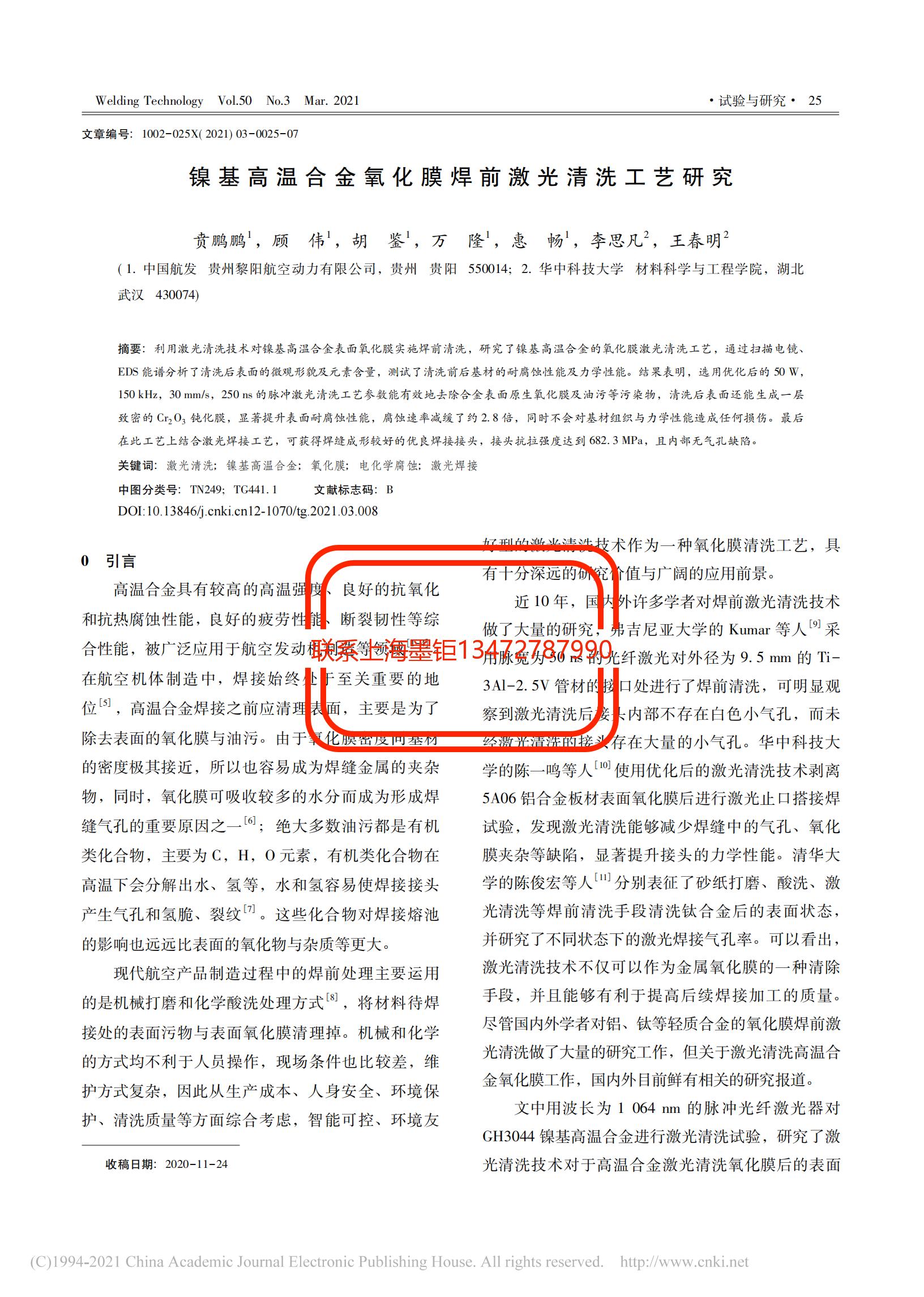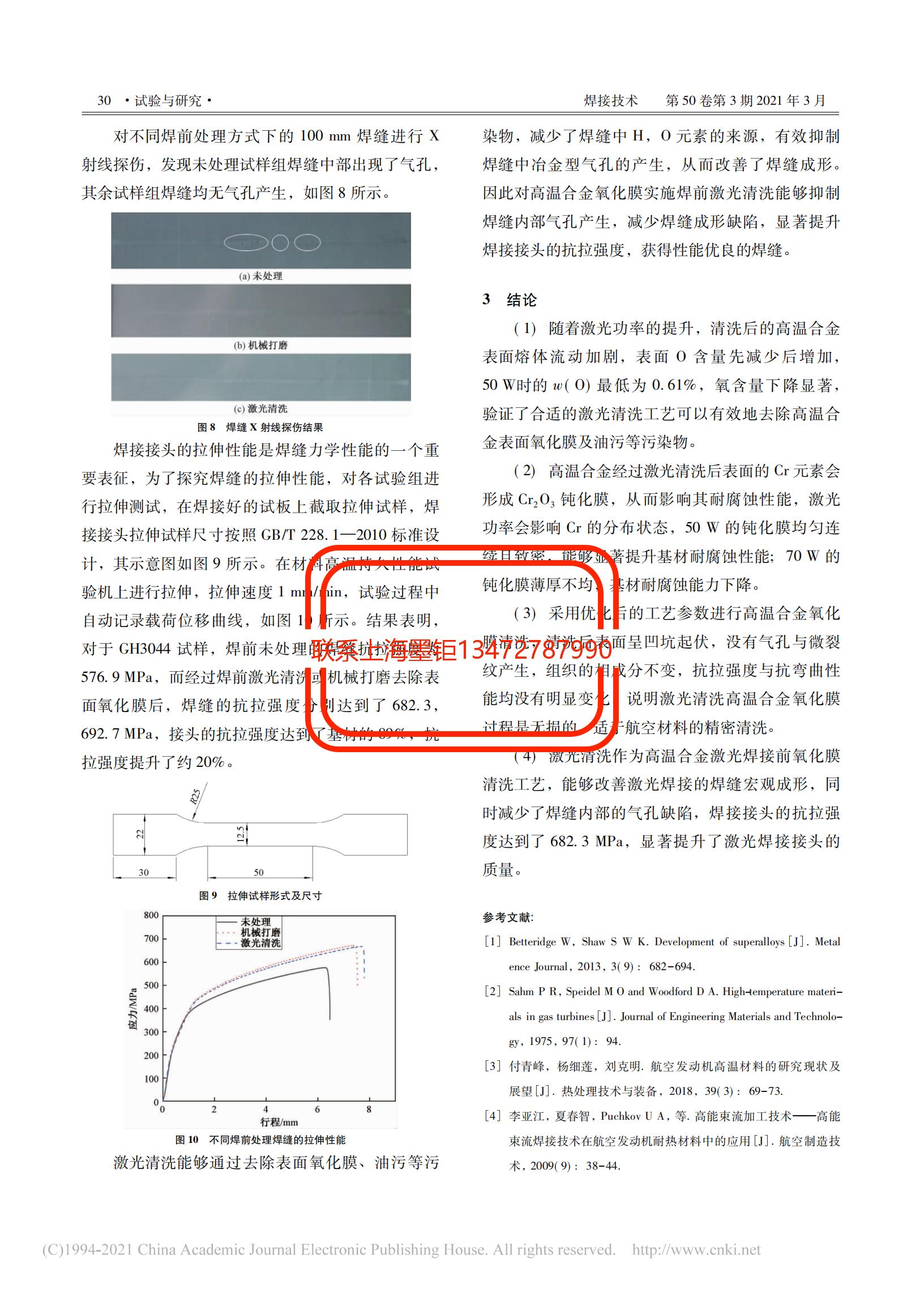 技術(shù)文章 鎳基高溫合金氧化膜焊前激光清洗工藝研究 更新時(shí)間 2021-07-20 02:58:12 閱讀 826 上一篇:GH3044高溫合金激光熔覆焊接工藝研究 下一篇:PtIr25與GH3044異種材料激光焊裂紋缺陷研究