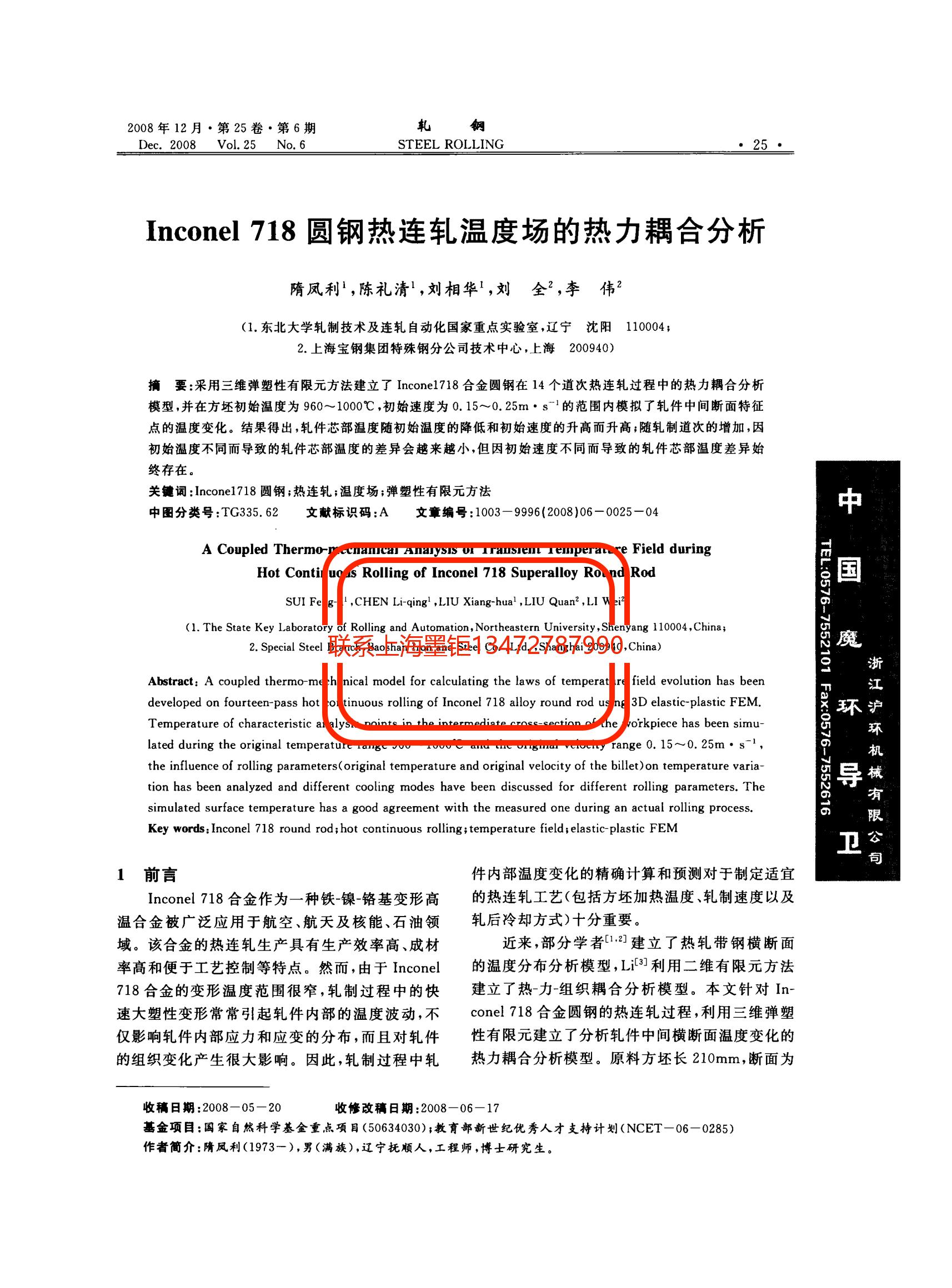 技術(shù)文章 Inconel718圓鋼熱連軋溫度場(chǎng)的熱力耦合分析 更新時(shí)間 2021-07-12 09:47:00 閱讀 772 上一篇:超細(xì)晶Inconel 718合金激光對(duì)接板的高溫拉伸性能(英文) 下一篇:Inconel718合金厚板真空電子束焊接頭的顯微組織與高溫力學(xué)性能