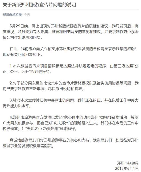而6月2日,鄭州市旅游局在其官方公眾號發(fā)布關于新版鄭州旅游宣傳片問題的說明顯示,“5月29日晚,網(wǎng)上出現(xiàn)對鄭州新版旅游宣傳片的質(zhì)疑和建議,我局發(fā)現(xiàn)后,高度重視,及時安排專人收集、整理和歸納網(wǎng)友的意見和建議,并要求制作方中視金橋公司作出說明和回復!
