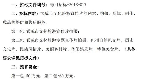 甘肅省武威市文化旅游宣傳片拍攝制作采購項目招標文件顯示,武威市文化旅游宣傳片拍攝和武威市文化旅游專題宣傳片拍攝(包括自然風光片、歷史文化片、民族風情片、美麗鄉(xiāng)村片、休閑娛樂片、特色美食片)的預算資金分別為50萬元和60萬元。
