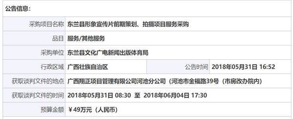 比如,還在招標的2018年廣西東蘭縣形象宣傳片前期策劃、拍攝項目服務采購預算為49萬元。