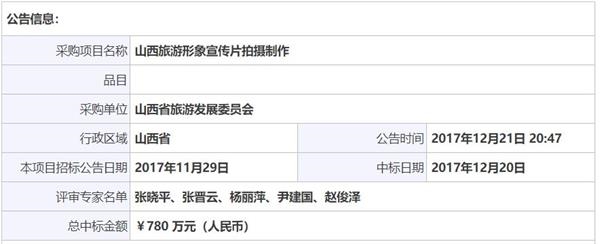神木市旅游局曾于2014年7月公開招標“神木旅游局形象宣傳片拍攝制作”,根據(jù)神木市政府采購中心2014年8月21日發(fā)布的中標公告顯示,文匯津川(北京)文化傳媒有限公司中標神木旅游局形象宣傳片拍攝制作,中標金額526.975萬元。
