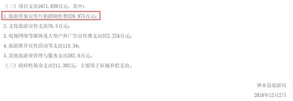 這一金額,在神木市政府官網(wǎng)公開的旅游局2015年財政決算支出中也得到印證。