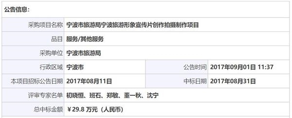 再如,2017年寧波旅游形象宣傳片創(chuàng)作拍攝制作項目,中標金額為29.8萬元。