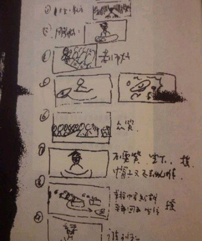 分鏡頭腳本又稱攝制工作臺(tái)本,也是將文字轉(zhuǎn)換成立體視聽形象的中間媒介,主要任務(wù)是根據(jù)解說詞和電視文學(xué)腳本來設(shè)計(jì)相應(yīng)畫面,配置音樂音響,把握片子的節(jié)奏和風(fēng)格等。分鏡腳本中畫面部分,一般是手繪分鏡。我們來看下徐克、馮小剛、姜文這三位知名導(dǎo)演的手繪分鏡。