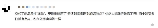 不過,有的網(wǎng)友腦補得就很精彩:對于廣告語本身而言,“我們的青春全在裸睡的床單里”也算出彩。不僅引起了正值青春的年輕消費群體的注意,也交代了商品屬性“床單”,更悄悄暗示了“舒適到能裸睡”的商品特點。簡單來說,是句一石三鳥的好文案。